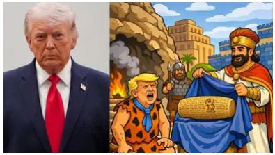 पहला ट्वीट- यह सबसे आकर्षक और सबसे ज्यादा चर्चित रहा। इसमें एक रंगीन कार्टून है, जिसमें डोनाल्ड ट्रंप को ठीक फ्लिंटस्टोन्स कार्टून के फ्रेड फ्लिंटस्टोन की तरह दिखाया गया है- चट्टानों के बने कपड़े, नीला टाई, मुंह खुला हुआ और गुस्से में चीखते हुए। उनके बगल में खड़ा है एक प्राचीन फारसी राजा जो साइरस द ग्रेट जैसा लगता रहा है। उसने लाल चोगा, सोने का मुकुट पहना और मुस्कुरा रहा है। राजा नीला कपड़ा हटाकर एक प्राचीन मिट्टी का बेलन (सिलेंडर) दिखा रहा है, जिस पर पुरानी फारसी लिपि और शेर की नक्काशी है। पीछे आग जल रही है, एक फारसी सैनिक भाला लेकर खड़ा है और दूर पुरानी ईरानी इमारतें व गगनचुंबी दीवारें दिख रही हैं। कैप्शन में लिखा: फ्लिंटस्टोन्स और फारसी साम्राज्य। कला के जरिए सच्चाई।