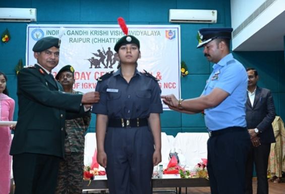रायपुर।कृषि महाविद्यालय, रायपुर में आर्मी डे के अवसर पर आज स्वामी विवेकानंद ऑडिटोरियम में एक विशेष कार्यक्रम का आयोजन किया गया। इस अवसर पर एयर विंग एनसीसी में चयनित 13 छात्र-छात्राओं का बैज लगाकर औपचारिक रूप से नामांकन किया गया।कार्यक्रम की शुरुआत वंदे मातरम् तथा विश्वविद्यालय के कुलगीत से हुई। इसके पश्चात कार्यक्रम के मुख्य अतिथि ब्रिगेडियर डी.के. पात्रा, ग्रुप कमांडर, एनसीसी एवं अन्य अतिथियों का स्वागत किया गया। कार्यक्रम की अध्यक्षता इंदिरा गांधी कृषि विश्वविद्यालय के कुलपति डॉ. (कर्नल) गिरीश चंदेल ने की। विशिष्ट अतिथियों में विंग कमांडर विवेक कुमार साहू, कमांडिंग ऑफिसर, 3 सीजी एयर स्क्वाड्रन एनसीसी, रायपुर उपस्थित रहे। अतिथियों का स्वागत पुष्पगुच्छ एवं स्मृति-चिह्न भेंट कर किया गया।