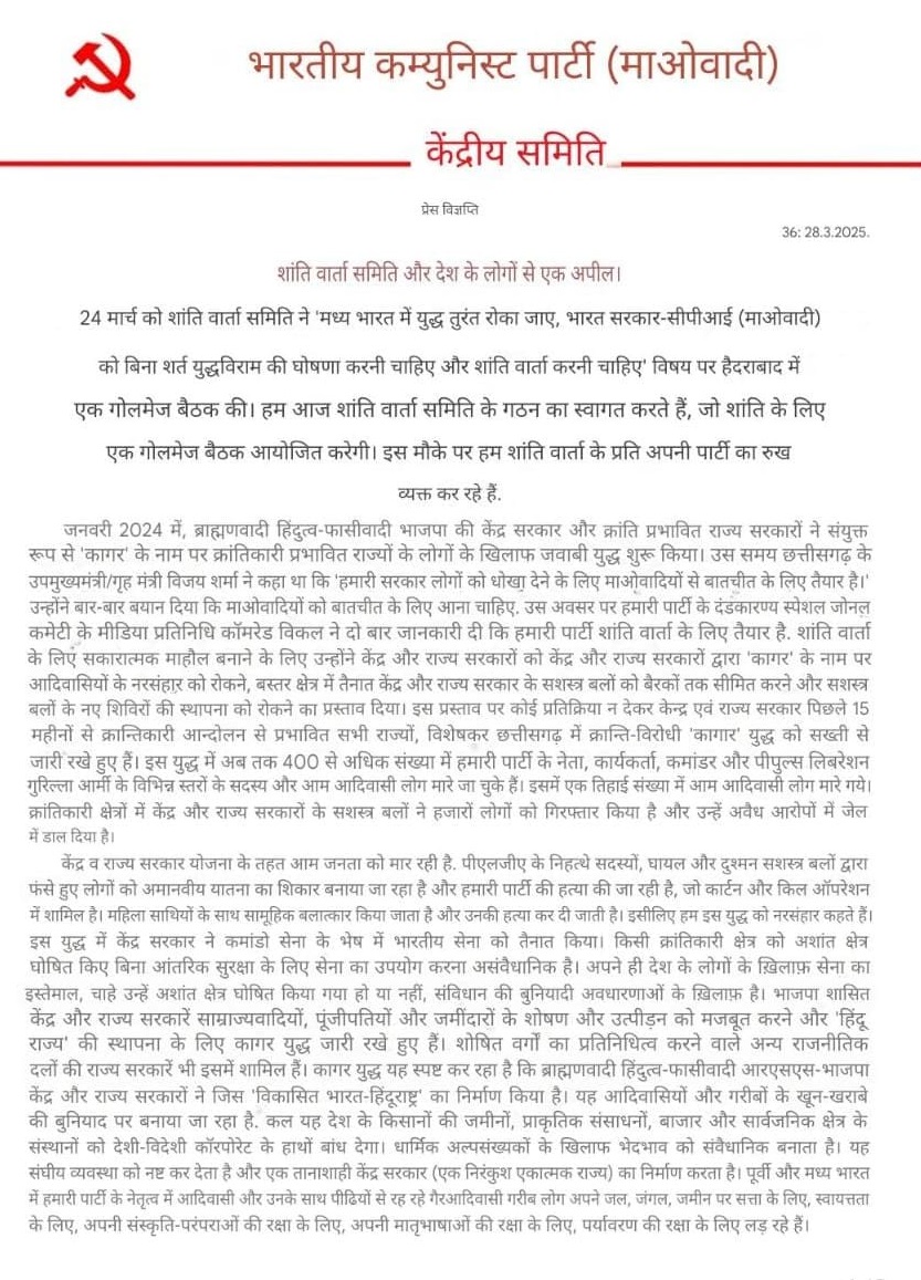 तेलगु भाषा में पर्चा जारी करते हुए लिखा है कि, 24 मार्च को हैदराबाद में संगठन की एक बैठक हुई थी। जिसमें बिना किसी शर्त के शांति वार्ता के लिए आगे आने और बातचीत कर युद्धविराम की घोषणा करनी चाहिए इस पर बात हुई। अभय ने लिखा है कि छत्तीसगढ़ के गृह मंत्री विजय शर्मा ने शांति वार्ता के लिए पहल की थी। बता दें कि 5 अप्रैल को केंद्रीय गृहमंत्री अमित शाह बस्तर दौरे पर रहेंगे।पर्चे में लिखा है कि, जब हमारे दंडकारण्य स्पेशल जोनल कमेटी के सदस्य और माओवाद संगठन के प्रतिनिधि विकल्प ने शांति वार्ता के लिए अपनी शर्त रखी थी कि जवानों को कैंप तक ही रखा जाए। ऑपरेशन को बंद किया जाए। जिसके बाद बातचीत करेंगे। इन शर्तों का जवाब दिए बगैर लगातार ऑपरेशन चलाए गए। पिछले 15 महीने में हमारे 400 से अधिक नेता कमांडर, PLGA के कई स्तर के लड़ाके मारे गए।