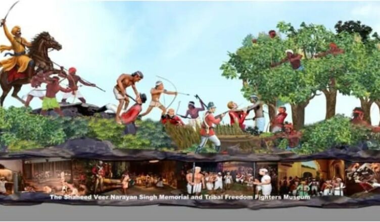 झांकी के पृष्ठ भाग में छत्तीसगढ़ के प्रथम शहीद वीर नारायण सिंह को घोड़े पर सवार, हाथ में तलवार लिए दर्शाया गया। उन्होंने अकाल के समय गरीबों और वंचितों के अधिकारों की रक्षा के लिए संघर्ष किया और 1857 के प्रथम स्वतंत्रता संग्राम में अग्रणी भूमिका निभाई।
